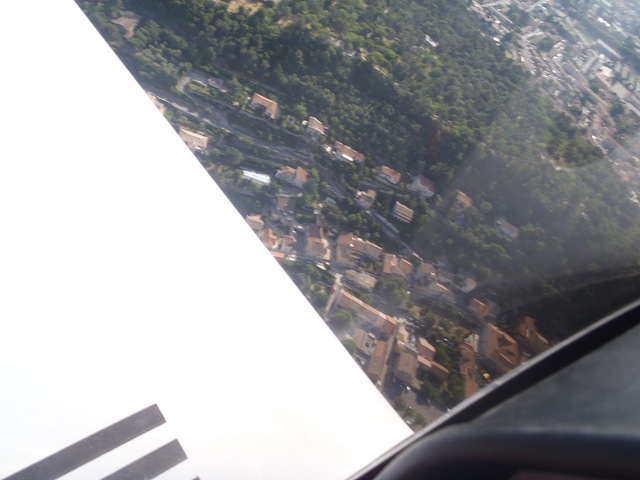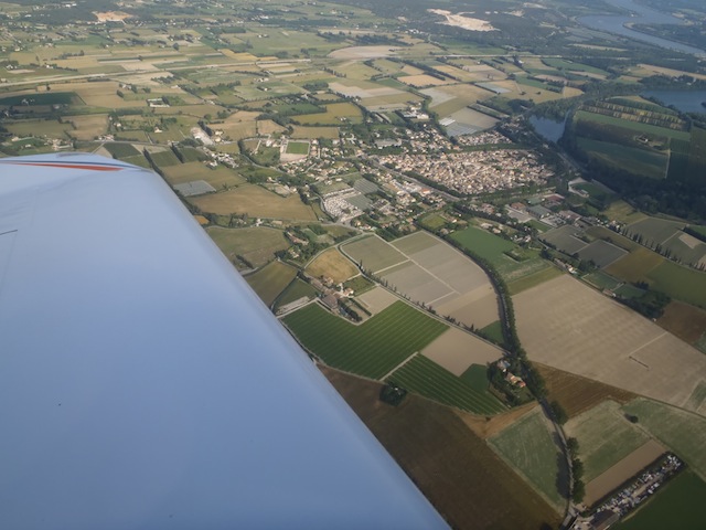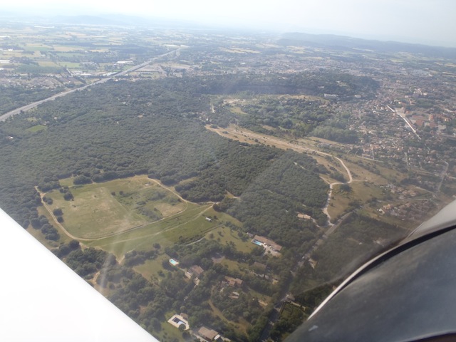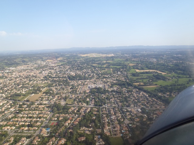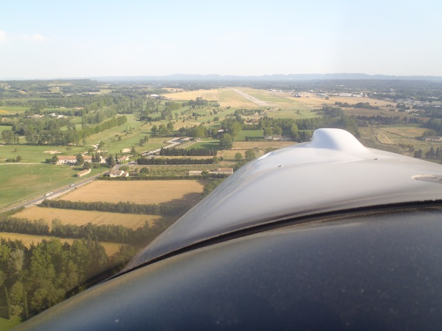 En route pour Orange. Le contrôle aérien signale que la base de Camaret et ses Mirages n'est pas active, le chemin est donc libre. A moins de trois minutes on distingue devant la colline d'Orange, le collège Saint Louis. J'ai pris les commandes, quel plaisir, l'avion est stable, neutre, une légère pression sur le manche et, comme dans le simulateur de vol, l'avion répond, monte, s'incline. Si je m'écoutais, je serais convaincu que je pilote depuis toujours. Trop facile ! |