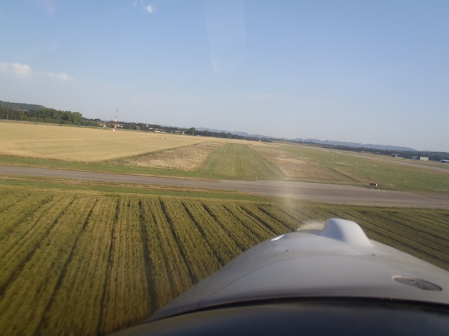terminée, un 180 pour se retrouver face au Sud. Au loin on distingue la piste en dur mais pour le FUN on se posera sur celle de gauche, en herbe, réservée aux ULM. Encore 3 minutes d'approche, j'ai rendu les commandes mais j'ai acquis la conviction que sur une piste longue j'aurai pu poser l'avion. Vanité des Vanités. Je dois probablement sur-évaluer mes capacités. C'est tellement humain. |
