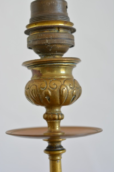Chandelier en laiton monté en lampe de salon. Sans abat-jour. Montage électrique à revoir. |